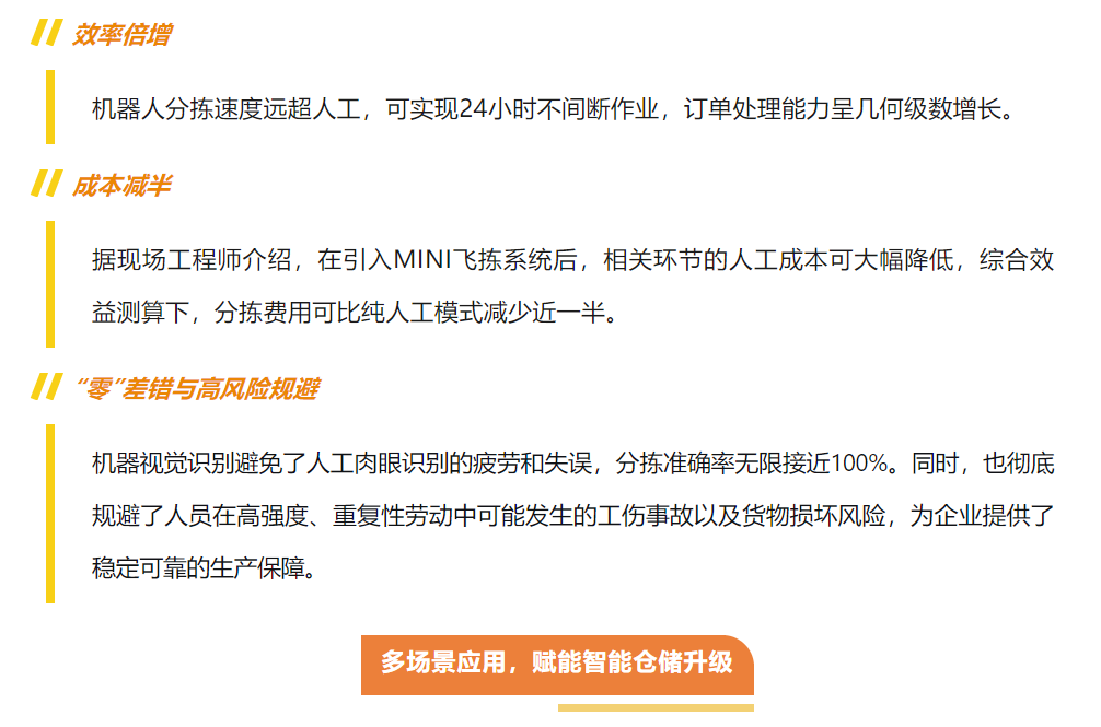 在青島工廠的測試環境中,MINI飛揀機器人展示了其卓越的適應性。它能夠輕松適配多種行業的小件商品分揀場景,包括醫藥行業的藥品盒與試劑分揀、快遞物流的小件包裹分撥、電商零售的爆單處理、鞋服行業的產品分揀以及商超配送的日用品分揀等。