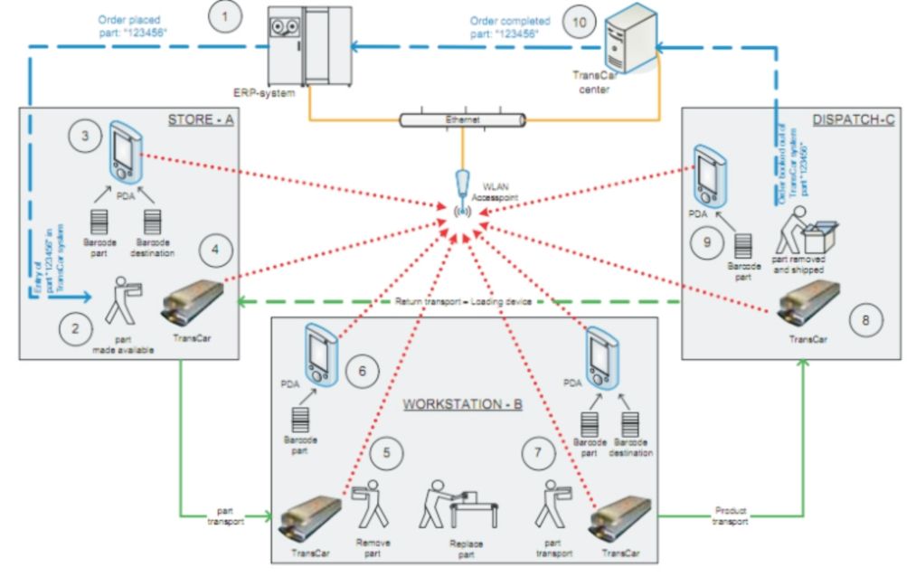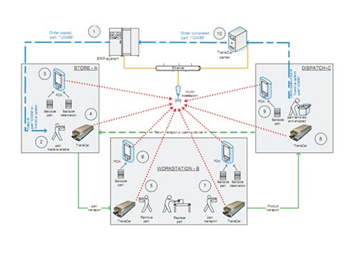 AGV交通管制軟件系統與AGV間采用無線通訊(WIFI)方式,交管系統和AGV構成無線局域網。交管系統依靠無線局域網向AGV發出系統控制指令,任務調度指令,避讓調度指令。交管系統同時可接收AGV發出的通訊信號。AGV依靠無線局域網向交管系統報告各類指令的執行情況、AGV當前的位置及AGV當前的狀態。